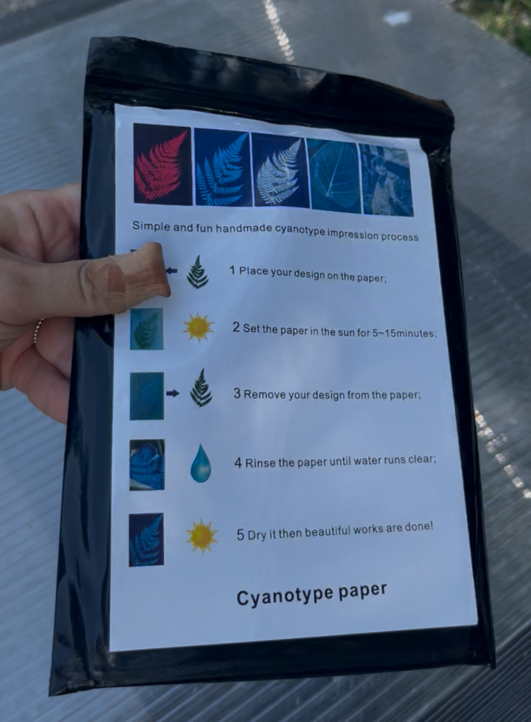 One of the most important parts of this project is to make sure that you don’t expose your paper to sunlight before you have placed your items. We worked on a table under a shade tree to avoid sun exposure. If you work in the sun, you will have a blurry image and it won’t turn out right. Also make sure you work with dry hands. We did multiple rounds and learned that wet hands will mess with the chemicals on the paper.