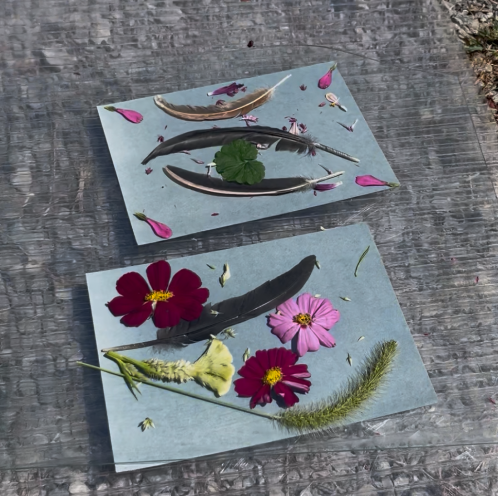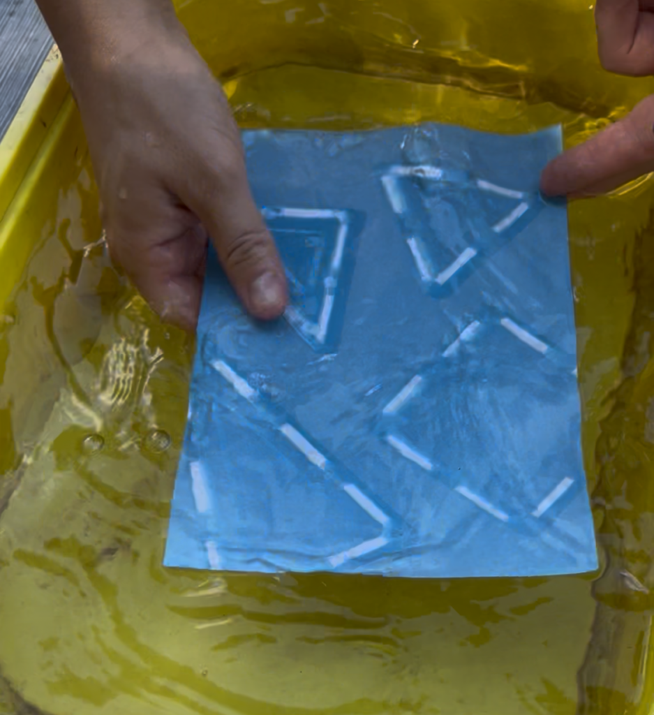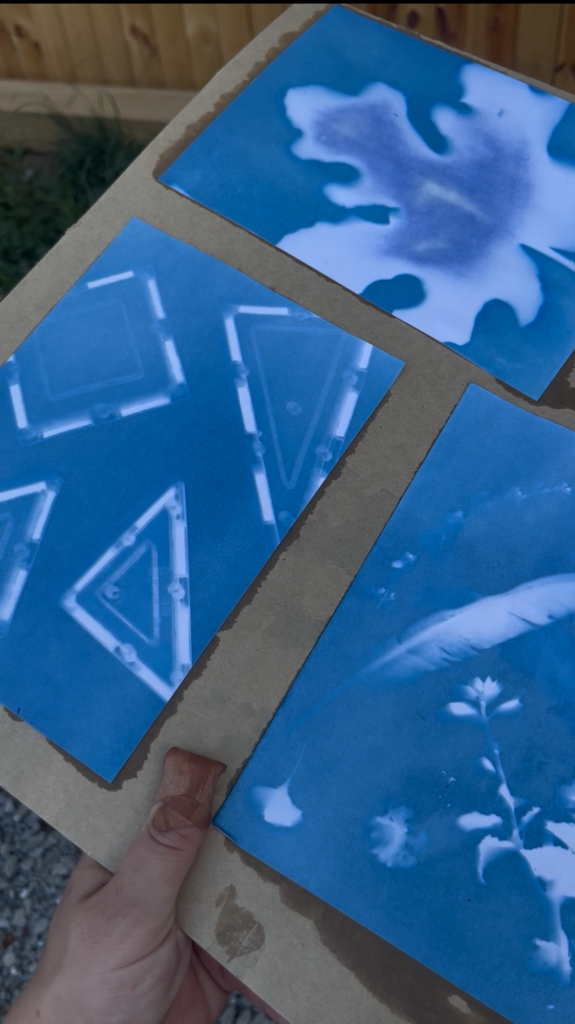 Then you will move it into the sun and let it sit for 5-15 mins. It won’t look like much is happening in that time frame but when you remove the subject matter from the paper you should see a change in color. Then you rinse until the water runs clean and let it dry. It should be a bright royal blue color, and will get a little darker as it dries.