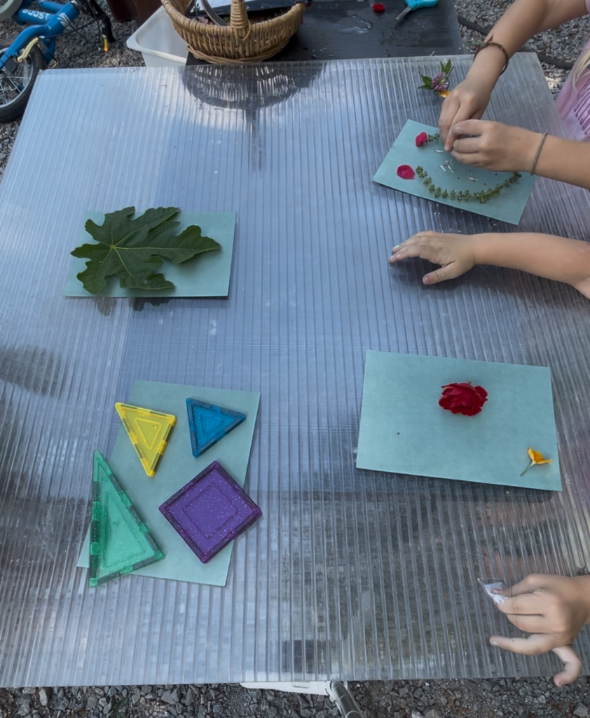 You will need to gather all of your fun items you plan to use on your sun art. We collected grass, herbs, flowers, toys, feathers, and rocks. All of the items need to be pretty flat, but you can get creative. I let my kids make whatever they wanted for this project, because we didn’t have anything learning specific in mind. We were just enjoying the process and over all concept. But if you wanted to make this more educations here are some ideas: