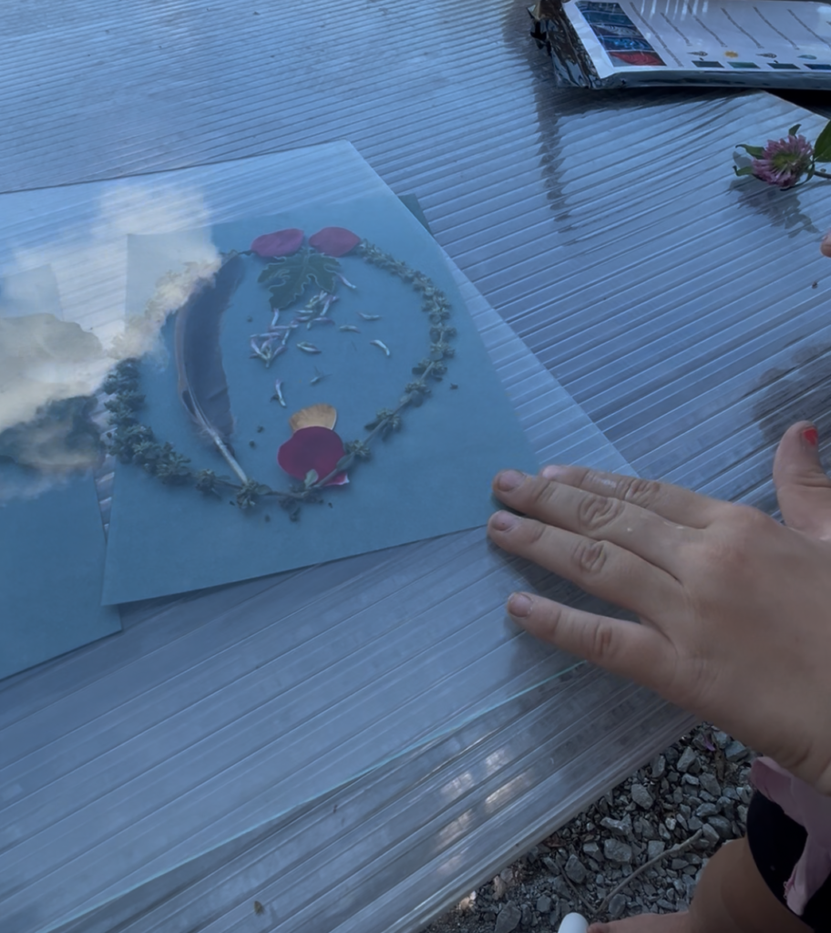 You will take the things they have collected and arrange them on the paper. Then you will need to place the glass over top of the design to keep it from blowing away or moving while it sits in the sun. We also worked on top of a piece of plastic that allowed me to move the art into the sun. You could use a piece of cardboard, wood, a rolling table, or whatever you have on hand. If you get a picture frame from the thrift store the backer to it would work too.